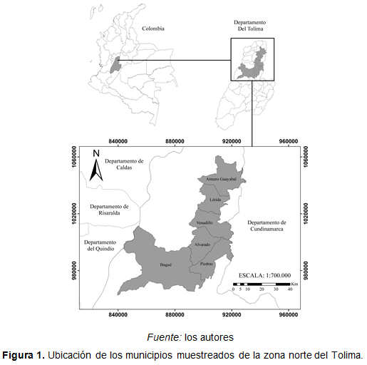 El estudio se desarrolló en fincas agropecuarias de la cuenca alta del río Magdalena en la zona seca del norte del departamento del Tolima, específicamente en los municipios de Alvarado, Venadillo, Lérida, Piedras, Ibagué y Armero-Guayabal (Figura 1). Las fincas están ubicadas en la zona de vida del bosque seco tropical (bs-T) que se distribuye entre 0-1000 m de altitud, con temperaturas superiores a los 24°C y precipitación anual que varía entre 250 y 1800 mm (Holdridge, Grenke, Hatheway, Liang y Tosi, 1971).