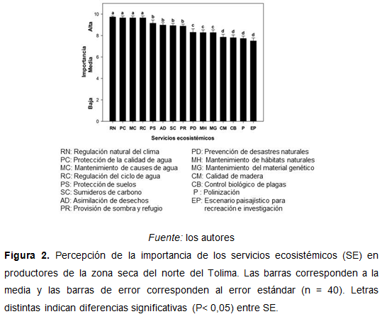La percepción de los productores sobre la importancia de los SE evaluados es alta (8-10) según la escala de Likert (1932), a excepción de la calidad de madera, control biológico de plagas, escenario paisajístico para recreación e investigación y polinización, los cuales presentaron una mediana importancia (4-7,9). La mayor importancia fue alcanzada por el mantenimiento de los cauces de agua, protección de la calidad de agua, regulación del ciclo del agua y regulación natural del clima; los cuales fueron estadísticamente diferentes al resto de SE (P < 0,05; Figura 2).