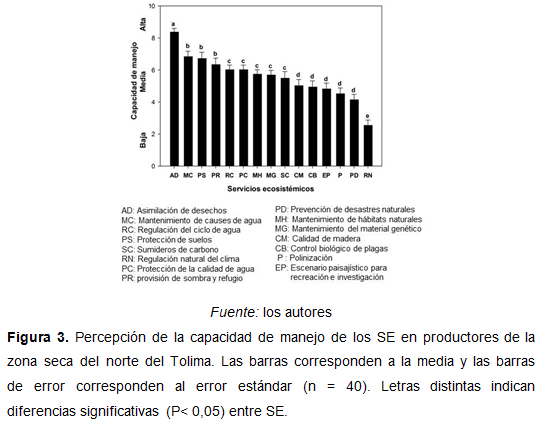La capacidad de manejo que perciben los productores no refleja la planificación efectiva para que disminuya la vulnerabilidad y garantice la conservación de la biodiversidad en el bosque seco del norte del Tolima. La percepción local de los SE es el primer paso para luego generar desarrollo sostenible al realizar un adecuado uso de los servicios que presta el ambiente en esta zona.