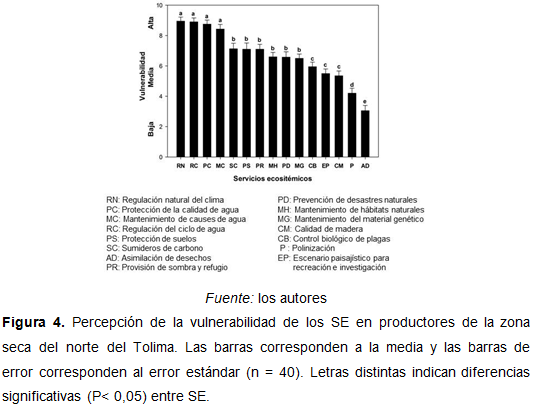 En general, los productores creen que la vulnerabilidad de los SE es alta (8-10), principalmente lo relacionado con el mantenimiento de los cauces de agua, la protección de la calidad del agua, la regulación del ciclo de agua y la regulación natural del clima. En contraste, la vulnerabilidad más baja (0-3,9) es percibida en la asimilación de desechos. La vulnerabilidad percibida por los productores presentó diferencias significativas (P < 0,05) entre SE (Figura 4).