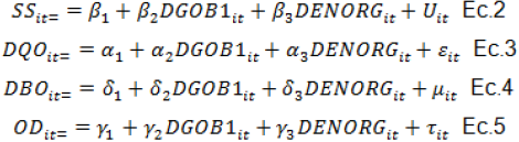 Donde las variables endógenas como se mencionó antes, son los sólidos suspendidos (SS); (DBO) es la demanda bioquímica de oxígeno; (DQO) expresa la demanda química de oxígeno (DQO) y finalmente (OD) es el oxígeno disuelto. Las variables explicativas son la gobernanza (DGOB1) la cual hace referencia a la presencia o no de entidades de alcance y origen regional en los procesos de gestión del río. En consecuencia, el planteamiento asume una postura dicotómica con el valor de 1 cuando hay tal actuación y el valor de cero si no hay ninguna presencia en materia de intervención. De otro lado, las variables Uit ; εit ;μit ;τit, denotan los términos aleatorios de error para cada modelo respectivamente. Es decir recogen para cada uno, las variables que influyen en las diferentes medidas de contaminación tanto en el tiempo como en el espacio, pero que no han sido tenidas en cuenta de forma explícita en cada uno de ellos. Se asume que dichas variables son iid (0,σ2), es decir, están distribuidas de manera independiente e idéntica, con media cero, varianza constante y además con covarianza nula, o con otras palabras son “ruido blanco”. Para efectos de la prueba de las hipótesis, se supone que están distribuidos normalmente.