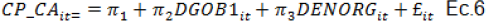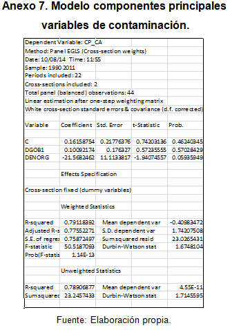 En este caso, como se mencionó anteriormente, la técnica de componentes principales se aplica a las medidas de contaminación, para sintetizar todas como una sola y utilizarla como variable endógena. Las exógenas de nuevo serían las variables institucionales de gobernanza y densidad organizativa.20 Por los argumentos anteriormente discutidos, esta modelación también se estimará por efectos fijos entre agentes. Por tanto el modelo estocástico es el siguiente: