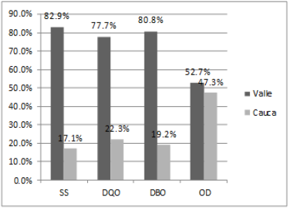 Los niveles de sólidos suspendidos (SS); las demandas químicas y bioquímicas de oxígeno (DQO y DBO) guardan una relación de 4 a 1, mientras que para el caso del oxígeno disuelto (OD) la relación es casi de uno a uno. Esto muestra que el departamento del Cauca le entrega al Valle un río menos contaminado, porque en este último los niveles de contaminantes en general se amplían ostensiblemente. Posiblemente la razón de este fenómeno obedezca entre otras cosas a que el departamento del Valle muestra un nivel de industrialización superior comparado con el Cauca.