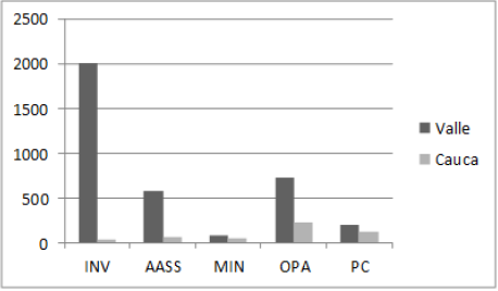 Como se puede apreciar en el gráfico siguiente, el Valle del Cauca muestra los mayores niveles de contaminación promedio frente al Cauca, entre la década de los noventa y la primera del nuevo milenio.