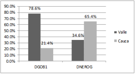 Finalmente, las variables institucionales de gobernanza (DGOB1) la cual hace referencia a la presencia o no de entidades de alcance y origen regional en los procesos de gestión del río, y (DENORG) que es la densidad organizativa ambiental, que recoge el nivel de actividad de la sociedad civil organizada en asociaciones, fundaciones, corporaciones, entre otras; encuentra un resultado llamativo. En el departamento del Valle es mayor la presencia institucional del estado para gestionar los problemas del río comparado con el departamento del Cauca, pero la situación es contraria para la densidad organizativa, donde este último muestra una sociedad civil mucho más organizada que el Valle, para tratar la problemática. Esto podría explicarse a manera de hipótesis que la menor presencia del estado en el Cauca obliga a que la sociedad civil se organice, y por vía contraria en el Valle no sea una prioridad, cuando se trata de lidiar con los problemas de contaminación del río.