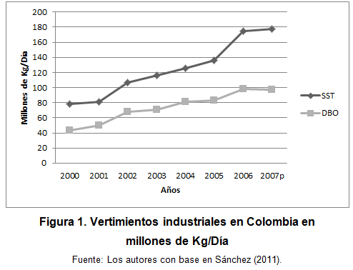 Desde otra perspectiva, otros trabajos presentan una mirada menos positiva del asunto, dando mayor sustento al planteamiento que aquí se trata. En un estudio desarrollado por la división de estudios regionales del Banco de la República, Sánchez (2011) muestra la inefectividad de la tasa retributiva frente a parámetros clásicos de contaminación. Como se puede registrar en la figura siguiente, los niveles de contaminación principalmente medidos por sólidos suspendidos y demanda bioquímica de oxígeno, presentan un comportamiento ascendente particularmente desde 2001, con preeminencia del primer parámetro sobre el segundo. Luego, la trayectoria tiende a moderarse hacia el final de la década. El fenómeno resulta curioso en tanto las reformas sucesivas al instrumento derivadas de la ley 99 de 1993, quisieron ampliar el mecanismo de ajuste regional y buscaron mucha más eficiencia de la gestión pública descentralizada.