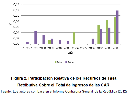 Es de anotar que aunque la metodología es más de carácter descriptivo a partir de auditorías, sobre la eficiencia y la efectividad en el gasto de las autoridades ambientales; se puede evidenciar que a pesar de que el presupuesto de las corporaciones participa por lo menos con el 80% de los recursos del sector ambiental nacional; las tasas retributivas en el panorama general representaron entre 1998 y 2005, a duras penas el 1,8% de las rentas propias ordinarias de las corporaciones (sin contar con las rentas de capital). Idos al plano regional, la CVC apenas llega al 0,12%, mientras que la CRC ni siquiera alcanza el 0,9%.