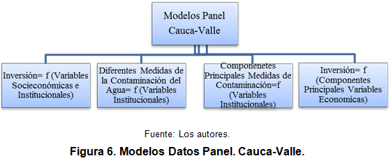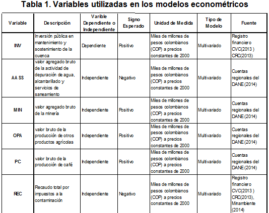 En general, la consideración para utilizar cuatro modelos es que con el de datos panel se tiene una visión dinámica y general del fenómeno estudiado, como lo han implementado en otros estudios sobre contaminación De otro lado, siguiendo a Argüello, Delgadillo y García (2009); o Coria (2007); la modelación ANOVA debe introducirse para hacer énfasis en el papel exclusivamente institucional de forma estática, considerando diferentes medidas de contaminación. El modelo de componentes principales tiene el mismo sentido del anterior, pero reconoce que las medidas de contaminación son diversas y por tanto las condenas en una sola. Finalmente, se estima un último modelo para tratar de capturar si los incrementos en la producción de los sectores económicos elevan la inversión ambiental, debida a la degradación del río.