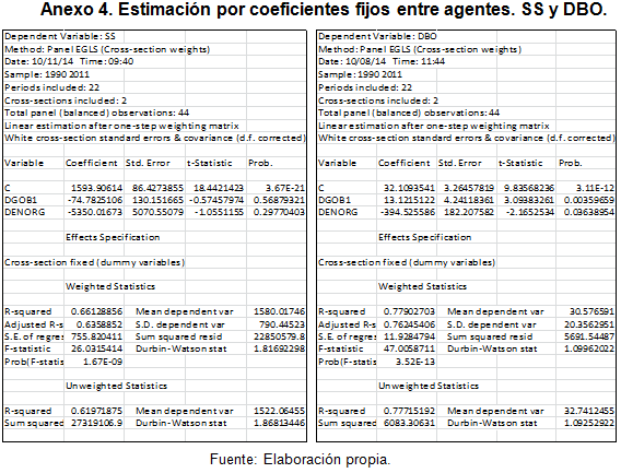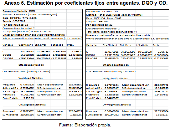 Como los modelos anteriores prueban dichas relaciones de causalidad en el tiempo (1990-2011) y en el espacio o agentes (Cauca y Valle), se estimará un panel balanceado por el método de efectos fijos entre agentes. No se consideran los efectos fijos en el tiempo ya que la contaminación del agua viene dada generalmente por los procesos productivos antes mencionados que son propios de la región analizada y por las políticas de regulación ambiental de las instituciones allí creadas. Es decir, no se considera que la contaminación haya cambiado en el periodo analizado por otros factores diferentes a los aquí mencionados. Además, existe otra razón técnica para no utilizar este procedimiento y es que los efectos diferenciales para cada año de la muestra se capturan con variables dicotómicas, lo que implica que deben calcularse (T-1) parámetros, más los presentes en el modelo para las variables explicativas, cuestión que en suma, reduce de manera ostensible los grados de libertad, lesionándose la inferencia estadística o en términos extremos la estimación de los modelos (Pérez, 2006)18.