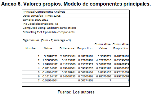 Adicionalmente, es preciso anotar que, debido a que algunas de las variables de contaminación antes mencionadas pueden estar relacionadas entre ellas, resulta poco convincente seleccionar una como representativa directa de la contaminación. En este orden de ideas se construyó una tercera modelación cuya característica fundamental es que toma todas las variables de contaminación y las sintetiza en una sola a través de la técnica estadística de Componentes Principales o Valores Propios (Eigen Values). Siguiendo a Miller y Gómez (2011); el método intenta “extraer” la información relevante de un conjunto de variables eliminando de ellos la información redundante o poco relevante. Finalmente, en un cuarto esfuerzo, se utiliza de nuevo la técnica de componentes principales, pero ahora para sintetizar las variables económicas y mostrar su relación con la inversión