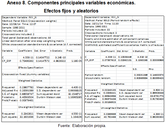 Siguiendo en la misma línea del caso anterior, se utilizó la técnica de componentes principales, pero ahora aplicados a las variables explicativas socioeconómicas (excluyendo las variables institucionales) para correrlas frente a la inversión. Las estimaciones se hicieron bajo efectos fijos y aleatorios, y se aplicaron las pruebas estadísticas necesarias para determinar cuál método es más confiable. Por tanto, el modelo fue el siguiente: