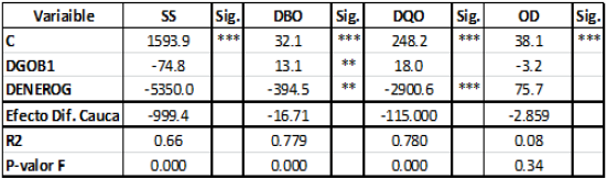 De otro lado, tampoco se considera relevante la estimación de los modelos por efectos aleatorios, toda vez que es poco creíble que los agentes (departamentos de Cauca y Valle) provengan de una muestra más grande de departamentos que contaminan el río Cauca; pues el río nace en el Cauca, lo recorre y pasa inmediatamente después a transitar por todo el Valle. Es decir, no es posible que otro departamento de Colombia influya en la contaminación del río en el tramo y en el periodo analizado. Adicionalmente, siguiendo a Judge et al (1994) existe otra razón de carácter técnica para emplear efectos fijos y no efectos aleatorios, y es que si T (el número de datos de series de tiempo) es grande y N (el número de unidades de corte transversal) es pequeño, como es el caso aquí analizado; es probable que exista muy poca diferencia entre los valores de los parámetros estimados mediante el método de efectos fijos y el de efectos aleatorios, siendo mejor el primero debido al insesgamiento a la hora de estimar los parámetros. Finalmente, por los intereses del estudio, es mejor aplicar el método de efectos fijos, ya que mostrará las medidas diferenciadas de la contaminación de los departamentos implicados, mientras que en el otro método no es posible hacerlo de manera explícita ya que los efectos diferenciadores en la contaminación serán una variable latente o inobservable que residirá en los términos aleatorios de error estimados en los modelos y es imposible su separación. Los resultados de manera resumida se presentan a continuación: 19