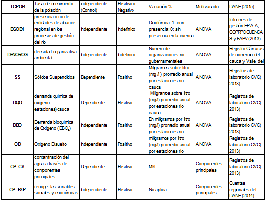 En el caso de las variables exógenas, ninguna recibió algún tipo de tratamiento estadístico, toda vez que fueron encontradas en su totalidad para el periodo muestral. Aunque vale aclarar que sus medidas se tomaron del DANE a precios constantes de 2000. De otro lado, se construyó una variable dicotómica como proxy de la gobernanza (DGOB1). Esta variable captura la presencia o no de las innovaciones institucionales regionales para atacar la problemática del agua en la cuenca con participación de multiactores; su información provino de diferentes fundaciones y asociaciones presentes tanto en el departamento del Valle como del Cauca, tales como la fundación Agua por la Vida, Corpocuencas y el Fondo para la Acción Ambiental.