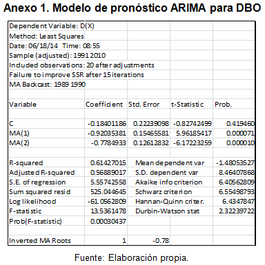 Para el desarrollo de los modelos econométricos se consideran como variables endógenas las medidas tradicionales que determinan la contaminación del agua tales como los Sólidos Suspendidos (SS); la Demanda Bioquímica de Oxígeno (DBO); la Demanda Química de Oxígeno (DQO) y finalmente el Oxígeno Disuelto (OD). Para ambos departamentos, hubo años en los cuales por causas desconocidas no se llevó un registro de dichas mediciones. Por tanto, para llenar los vacíos de los datos faltantes (missing data), se debió apelar a métodos estadísticos tales como modelaciones ARIMA bajo la metodología Box-Jenkins (en el caso de la DBO del Cauca) con el objetivo de pronosticar sus valores desde el año 2008 hasta el año 2011; y de otro lado, el método de aproximaciones polinómicas para las restantes variables que llenarían los vacíos entre dos cifras (ver anexo1).