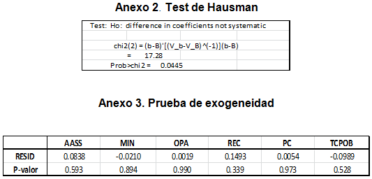 Los resultados muestran que la bondad de ajuste (medida a través del R2) es de 0,538; es decir que alrededor del 54% de las variables elegidas explican el comportamiento de la inversión. La mayoría de los signos son correctos y con altas significancias individuales. El valor positivo de la variable (AASS) muestra que a mayor nivel de depuración de las aguas residuales, la inversión pública se incrementaría en un elevado grado frente a otros sectores de presión; en términos precisos si el valor agregado de la industria de tratamiento, depuración de agua y alcantarillado se eleva en una unidad, la inversión se incrementa en $4,02; dejando todo lo demás constante. Aunque esto solo tiene sentido, si frente a las fallas de información que embargan regularmente al Estado y la sociedad en general, no existiera confianza en los indicadores tradicionales de degradación; luego, el alto costo de la información y su asimetría harían pensar que mayores niveles de actividad y generación de valor agregado, implicarían mayores niveles de contaminación y así más elevadas necesidades de inversión. A su turno, las actividades agrícolas (OPA) y la minería (MIN), un crecimiento en su desempeño también eleva la inversión pública ambiental, pero en una menor proporción que las AASS.14 Finalmente, vale mencionar que los modelos no presentan problemas de endogeneidad, ya que de acuerdo con la prueba de correlaciones entre variables exógenas y los errores estimados arrojan unos p-valores por encima de la unidad.15