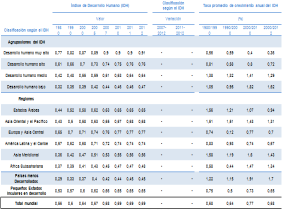El Programa de Naciones Unidas para el Desarrollo (PNUD), en el Informe sobre Desarrollo Humano (2013), muestra para América Latina que el promedio de los avances en las tres dimensiones básicas que miden el desarrollo humano (vida larga y saludable, conocimientos y nivel de vida digno), ha mejorado paulatinamente a lo largo del periodo 1980 – 2012 al pasar de 0,574 a 0,741 en 32 años (ver tabla 1), pasando de un nivel medio a un nivel alto según la evolución del IDH regional. No obstante, la tabla 1 también permite ver que la tasa promedio de crecimiento anual del IDH ha descendido en el mismo periodo de tiempo, pasando de 0,83 en la década 1980/1990 a 0,74 en la década 2000/2010 y ubicándose para 2012 en 0,67, el más bajo entre las 6 regiones del planeta.
