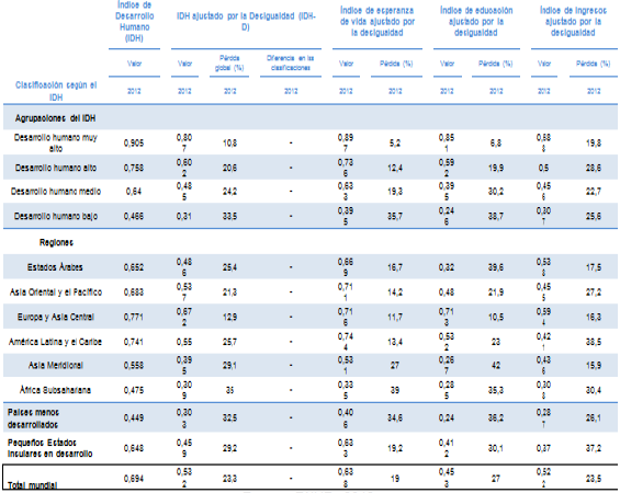 Sin duda alguna en los últimos 15 años América Latina ha registrado mejoras en salud, educación y esperanza de vida. Sin embargo, la desigualdad, la falta de movilidad social y la inseguridad han puesto un freno al desarrollo humano de la Región. Este rezago se ve claramente cuando el valor del IDH se ajusta por la desigualdad en las tres dimensiones básicas del indicador (tabla 2), pasando en 2012 de 0,741 a 0,550 lo que ubica a la región en un nivel bajo, con una pérdida global en el desarrollo humano potencial de 25,7% en el cual, el índice de ingreso representa la dimensión con mayor porcentaje de pérdida (38,5).