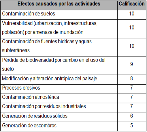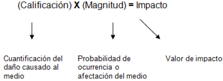 El método utilizado para la calificación de los principales impactos ambientales es una matriz modificada causa-efecto de tipo cuantitativo, en la cual se toma en cuenta la calificación del impacto, es decir un valor que determina el nivel de daño al medio de las principales actividades impactantes, y se multiplica por su magnitud (determinada por la probabilidad de ocurrencia o afectación del medio). De igual modo, esta valoración se relaciona con la sensibilidad y fragilidad del elemento ecológico o socioeconómico impactado, así como por lo estratégico del recurso afectado.
