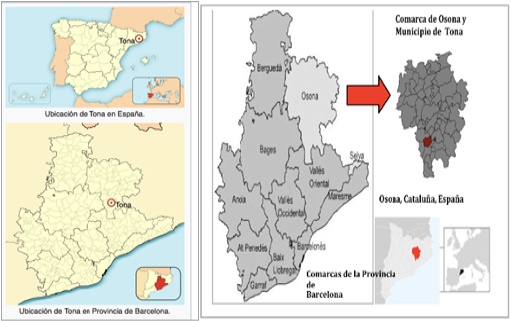 El municipio de Tona es uno de los 947 municipios que integran la Comunidad Autónoma de Cataluña-España, situada al nordeste de la península ibérica. Cataluña está constituida por cuatro provincias, que son Barcelona, Girona, Lleida y Tarragona, y dentro de ellas existen en total 41 comarcas (Generalitat de Catalunya, 2015). Precisamente, Tona hace parte de la comarca de Osona, una de las 12 que componen la provincia de Barcelona; por tanto, en cuanto a gobierno, el municipio está vinculado a la Diputación de Barcelona10 y al Consejo Comarcal de Osona11.