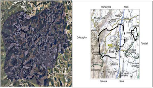 El municipio posee una superficie de 16,47 km2 y una altitud media de 598 metros sobre el nivel del mar. Tiene una localización estratégica al estar a sólo 10 kilómetros de Vic, la capital comarcal, y entre Barcelona, Manresa y Girona; por tal razón goza de una buena red de carreteras, conexiones viales e infraestructuras que hacen la población muy accesible desde cualquier punto de Cataluña12. Por demás, tiene como principales características geofísicas, el extenderse por el sector meridional de la gran depresión o valle encerrado de la plana de Vic y se enfila hacia la sierra del poniente en dirección a Collsuspina y Muntanyola. Su territorio está formado por margas blandas propias de la cuenca de erosión de la Plana de Vic. La erosión de aquellos tipos de terrenos ha configurado el paisaje de Tona, donde destacan las colinas, tales como el Aguilar, la sierra de la Cruz y del Puigbonic (Véase Figura 2).
