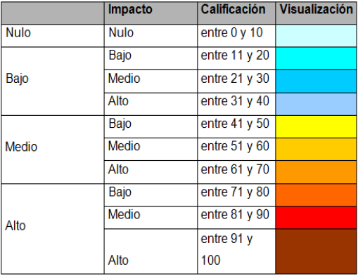 De este procedimiento se obtiene un valor de impacto que determina la importancia y capacidad de afectación al medio de cada una de las actividades, este valor se visualiza gráficamente (mediante colores) de la siguiente forma: