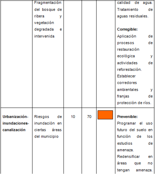 En cuanto a los impactos generados por la urbanización se deben adelantar una serie de proyectos prioritarios que conduzcan a minimizar los riesgos generados por la vulnerabilidad de algunas zonas residenciales a amenazas de inundación (impacto de 70/100). Por tanto, el principal objetivo de este programa de gestión ambiental es conocer y actuar con acciones preventivas y correctivas en las áreas del municipio frecuentemente inundadas y en las zonas donde existen condiciones de alto grado de afectación ante la probabilidad de los eventos naturales de crecidas torrenciales. Para ello es indispensable trazar en la hoja de ruta del municipio la compactación urbana y la redensificación residencial en áreas exentas de amenazas por inundación. En otros términos, es necesario ejecutar proyectos de renovación en sectores representativos de la ciudad y sin vulnerabilidad, por sobre la construcción de nuevos proyectos periurbanos.