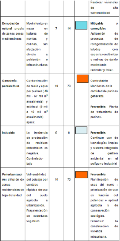 Impactos negativos: entre los impactos negativos se identifican la inadecuada disposición de residuos sólidos (escombros, basuras) por actividades de contrucción de viviendas y obras cíviles en áreas de importancia ambiental y paisajística del espacio urbano (Turó del Serrat del Castell); los riesgos por inundación en periodos de lluvias torrenciales y el ruido y material particulado en el desarrollo de las obras de construcción.