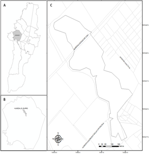 El estudio se realizó en El Burro, un humedal andino de planicie de origen fluviolacustre, que se caracteriza por estar ubicado en la sabana de Bogotá (Colombia), por debajo de los 2.700 msnm, con un espejo múltiple y áreas inundables morfométricamente no uniformes (DAMA, 2006). Se localiza en la localidad de Kennedy, entre los 4°38’33’’ N y 74°9’1’’ W (Figura 1). Tiene una extensión de 18,8 ha (González, 2008) y se encuentra fraccionado en dos partes por una vía principal (Avenida Ciudad de Cali); una noroccidental y otra suroriental, cerca de urbanizaciones, bodegas y depósitos de maquinaria pesada (INGETEC, 2007).