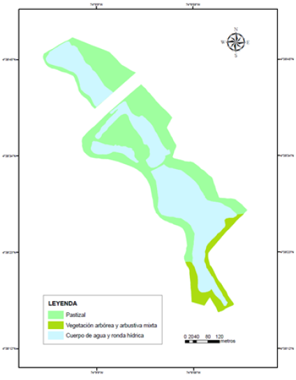 En la zona terrestre del humedal El Burro se identificaron dos unidades de vegetación que presentan una fisionomía propia. Un pastizal con un cubrimiento del 88% del área total, que contiene una leve cobertura de árboles y arbustos distribuidos de forma dispersa y una unidad de vegetación arbórea y arbustiva mixta, con una superficie del 12% (Figura 2).