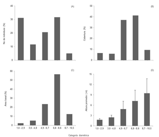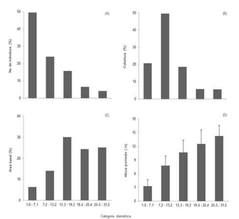 En cuanto a la cobertura, los individuos de la cuarta clase diamétrica (6,8 - 8,6 cm), presentaron los valores más altos (Figura 3B). Las especies que se destacaron en cuanto a sus valores de cobertura relativa fueron A. melanoxylon (27%), Salix humboldtiana (26%) y A. decurrens (23%). La especie S. humboldtiana ha sido utilizada como colonizador en programas de recuperación (Giraldo et al., 2009), dada su característica de alcanzar tallas considerables en pocos años (González y Cadenazzi, 2015).
