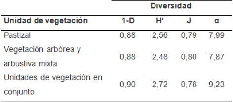 La unidad de vegetación con mayor diversidad arbórea y arbustiva la obtuvo el pastizal, determinada por los índices de Shannon-Wiener (2,56) y α de Fisher (7,99) (Tabla 2). Al comparar el pastizal y la vegetación arbórea y arbustiva mixta, se observó que la diversidad de especies, estimada mediante el índice de Shannon-Wiener, difiere significativamente (t262 (2) = 0,65, p<0,05).