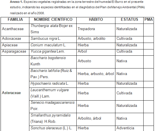 La evaluación del estado actual de la zona terrestre del humedal El Burro, como fase inicial del proceso de restauración ecológica, permitió la identificación de 51 especies, incluidas en 30 familias, de las cuales 28 corresponden a especies nativas (Anexo 1).