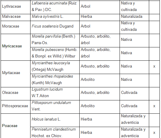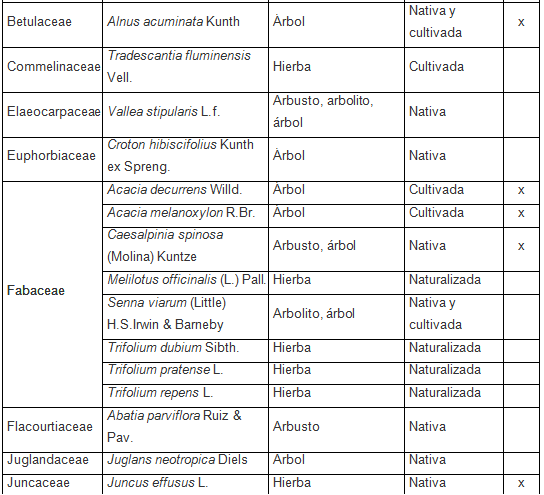 Dentro de las especies nativas registradas, se encuentran herbáceas anemócoras como J. effusus y Verbena litoralis, esta última considerada potencialmente invasora en los humedales de Bogotá por la capacidad de formar parches (Vargas et al., 2012); la herbácea zoócora Physalis peruviana; árboles y arbustos anemócoros como A. acuminata, B. latifolia, S. pyramidalis, Vallea stipularis, B. bogotensisy Dodonaea viscosa; y árboles y arbustos zoócoros como Juglans neotropica, Morella parvifolia, Morella pubescens, Myrsine coriacea, Hesperomeles heterophylla, M. rhopaloides, Duranta mutisii, Xylosma spiculifera y Abatia parviflora.