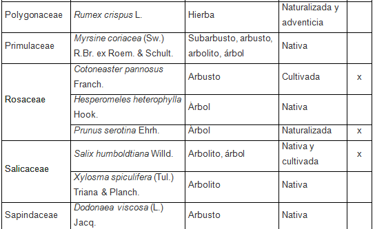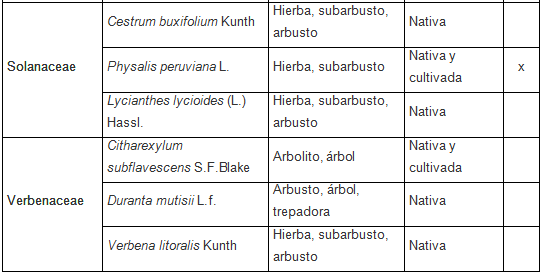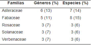 El 43% de la riqueza total de especies registradas pertenecen a Fabaceae (8), Asteraceae (7), Rosaceae (3), Solanaceae (3) y Verbenaceae (3). Estas familias también registraron el mayor número de géneros (Tabla 1).