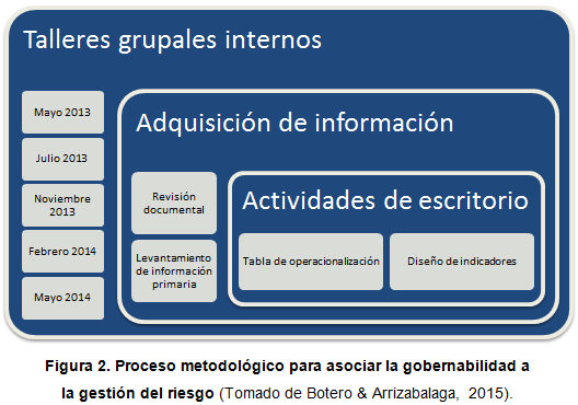 Posterior al taller de Cuba, se empezó la revisión documental en tres fuentes principales: a. Guías metodológicas de gestión del riesgo; b. Legislación colombiana sobre gestión del riesgo; y c. Literatura científica sobre indicadores, gobernabilidad y riesgos. La técnica utilizada es la descrita por Hurtado (2010), lo cual permitió que los hallazgos de cada documento pudieran ser automáticamente incluidos en la tabla de operacionalización.