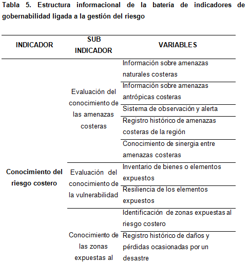 En definitiva, se presenta una estructura informacional que permite abarcar los aspectos más relevantes de la gestión del riesgo costero, en el contexto legal, técnico e institucional colombiano (tabla 5), a partir de la conversión de la tabla de operacionalización en una batería de indicadores medibles. Es importante resaltar que esta propuesta se enmarca en los lineamientos de las guías de gestión del riesgo revisadas (ONU, 2005; PREDECAN, 2009; PNUD, 2011), así como en los lineamientos de la GCI desde la perspectiva sistémica (Botero, Evaluación de los esquemas de certificación de playas en América Latina y propuesta de un mecanismo para su homologación., 2013).