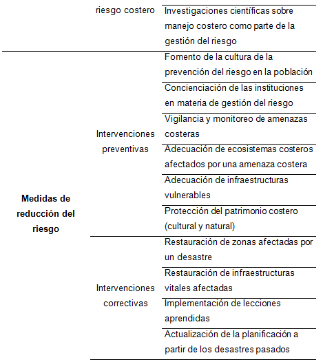 El segundo indicador se refiere a las medidas de reducción del riesgo, en el sentido del conjunto de acciones preventivas que se adoptan para disminuir las condiciones de riesgos existentes por parte del municipio costero. Este indicador se compone de cuatro sub-indicadores relativos a esta reducción del riesgo: a. Intervenciones preventivas; b. Intervenciones correctivas; c. Intervenciones prospectivas; y d. Protección financiera. Así mismo, la base de la estructura informacional la conforman diez variables que cubren aspectos desde el fomento de la cultura de la población en materia de gestión del riesgo hasta mejora de infraestructuras y recursos económicos para la reducción.