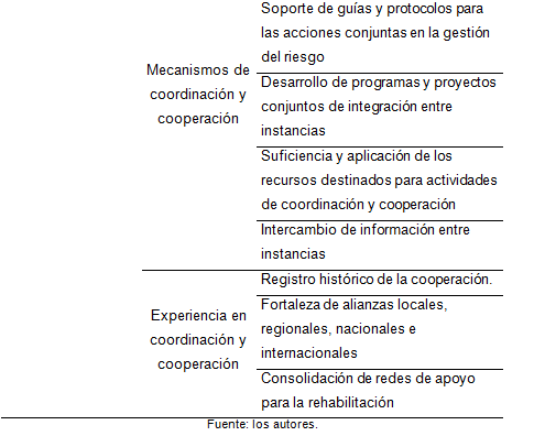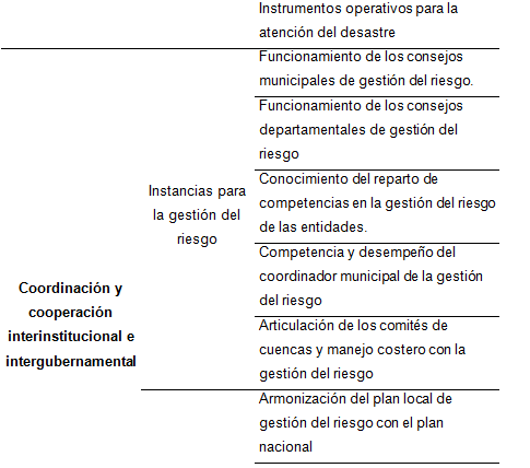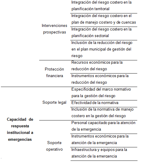 Dado que el objetivo de la investigación era la optimización de los procesos de gestión del riesgo en ciudades costeras, con miras a mejorar la gobernabilidad de estos territorios, y teniendo en cuenta que esta última se concibe como una cualidad, los indicadores establecidos permiten observar el grado de capacidad –por parte del gobierno– en la gestión del riesgo de desastres, en sus contenidos de política, es decir de conocimiento del riesgo, reducción del riesgo, capacidad de atención de emergencias, y en la necesaria articulación y cooperación interinstitucional. En consecuencia, se aprecia una integralidad y consistencia explicativa en los indicadores.