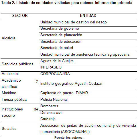 Simultáneamente a la realización del segundo taller, se realizó una intensiva búsqueda de información primaria en las entidades relacionadas con la gestión del riesgo en Riohacha. El objetivo de esta actividad se relaciona con lo ya expuesto sobre el caso piloto, donde se buscó identificar la situación real de la gestión del riesgo en las ciudades costeras del Caribe colombiano. En total se realizaron 15 entrevistas (tabla 2), a partir de un cuestionario preparado dentro del equipo de investigación colombiano y bajo la asesoría de la experta cubana.