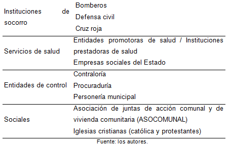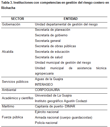 La tabla de operacionalización también sirvió de soporte para identificar las entidades locales públicas y privadas con competencias en la gestión del riesgo, bien fueran estas responsabilidades directas o indirectas. La identificación se realizó en el caso piloto (Riohacha), obteniendo más de 25 entidades ligadas con acciones enmarcadas en los cuatro eventos de investigación. La tabla 3 presenta el listado de instituciones que tienen alguna competencia en gestión del riesgo costero en el caso piloto.