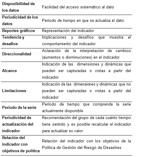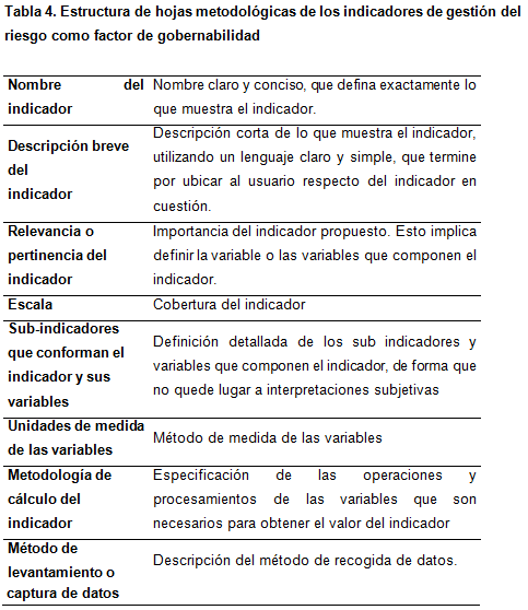 No obstante los resultados intermedios, el resultado más relevante fue la batería de cuatro indicadores para medir la gobernabilidad para la gestión del riesgo costero. El equipo de investigación logró un consenso según el cual cada indicador debería ir ligado a uno de los eventos de investigación, con lo cual se ganó en consistencia y coherencia. Asimismo, la estructura informacional se basó en las sinergias e indicios de la tabla de operacionalización, lo que facilitó la elaboración de las hojas metodológicas. El contenido de estas hojas partió de los ejemplos que presenta Quiroga (2009) sobre baterías de indicadores en América Latina y de la propuesta que ella misma recomienda en el cuerpo del documento, además de un ejercicio similar de diseño de indicadores de riesgo realizado en 2005 por la Universidad Nacional de Colombia (IDEA, 2005). Por último, el equipo de investigación agregó, ajustó y eliminó varios de los campos que dieron como resultado la estructura que se presenta en la tabla 4 y que se aplicó a los cuatro indicadores.