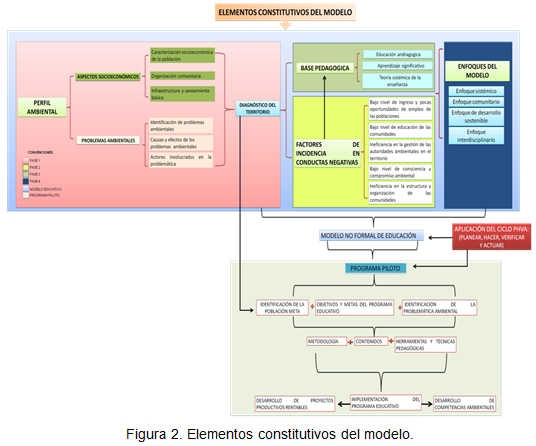 El fin del modelo educativo no formal propuesto fue generar planes y programas que contribuyeran a mitigar los problemas ambientales en el territorio, es decir, la materialización del modelo se reflejó en el diseño e implementación de un programa educativo piloto de corte no formal, el cual constó de la identificación de una población meta o beneficiaria del programa, la definición de objetivos y metas y la selección del problema o problemas ambientales donde se deseaba hacer la intervención; para el caso de Bañó y Los Negros, los problemas ya se habían identificado previamente con el perfil ambiental del territorio que dio como resultado el diagnóstico de la zona. Al partir entonces de los problemas identificados, y de acuerdo con el grado de importancia de los mismos, se procedió a hacer la intervención educativa. La metodología, los contenidos programáticos y las herramientas pedagógicas dependían directa y estrictamente de la definición de los elementos antes mencionados. Se señala que el modelo cuenta con un componente externo de mejora continua que se aplicó tanto al modelo mismo como al programa piloto que se generó; este componente se concretó en el ciclo PHVA (planear, hacer, verificar, actuar), buscando que el modelo fuera “resiliente” al paso del tiempo y su implementación. Con base en la definición de cada uno de los elementos que integraron el modelo de EANF, su representación gráfica se presenta en la Figura 2. El fin del modelo se centró en que las poblaciones aledañas a los humedales desarrollaran competencias favorables a la protección del ambiente, es decir que adquirieran el poder, el conocimiento y una actitud positiva para la conservación de los recursos presentes en el territorio.