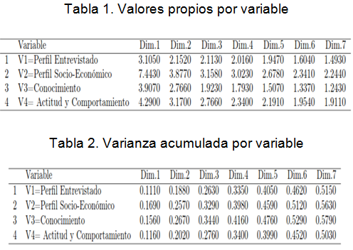 Con una muestra de 72 hogares, de una población total de 645 viviendas distribuidas en tres comunidades de la zona del estudio, se diseñó un cuestionario de 40 ítems (validado mediante un panel de expertos), subdivididos en 4 rubros diferentes: 9 ítems con respecto al perfil de los entrevistados, 6 ítems sobre aspectos económico-financieros de sus familias, 7 ítems en torno al tipo de sus viviendas y 18 ítems que abordaron elementos de percepción y cultura ambiental; también se incluyeron 4 ítems para validar el instrumento. Se elaboraron dichos ítems con base en: a) Representaciones sociales del medio ambiente de Calixto (2008); b) Actitudes ambientales de Moreno et al. (2005) y Esteban (2000); y c) Comportamientos pro ambientales de Palavecinos et. al. (2008). A partir de la aplicación de dicho cuestionario se midió con el AFM las siguientes variables latentes subdivididas en 114 categorías: V1-Perfil del entrevistado (24 categorías), V2-Perfil socio-económico (34 categorías), V3-Conocimiento (24 categorías) y V4-Actitud y comportamiento (32 categorías). Los cuatro ACP individuales han dado como resultado valores propios diferentes entre sí (Ver Tabla 1), este es un primer indicio de que las variables latentes son independientes y están midiendo diferentes ámbitos del modelo no formal de educación ambiental para la conservación y protección de los humedales Bañó y Los Negros. El número de dimensiones que inciden en las variables indican que es necesario incluir un número de dimensiones que van desde 13 dimensiones para la variable V1 con un porcentaje de variabilidad de 76%, 16 dimensiones para la variable V2 con un porcentaje del 85%, 11 dimensiones para la variable V3 con un porcentaje de variabilidad de 74%, y 11 dimensiones para la variable V4 con una variabilidad acumulada de 79% (Ver Tabla 2).
