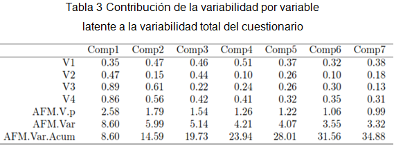 Adicionalmente, en la Tabla 3 se señala que las variables que contribuyen en mayor medida a la formación del primer plano factorial son V3 (conocimiento), y V4 (actitud y comportamiento) donde la inercia de cada variable es 0.89, y 0.86 respectivamente, mientras que al segundo eje contribuyen más las preguntas de la variable latente V1 y V3 con 0.47 y 0.61 de inercia respectivamente.