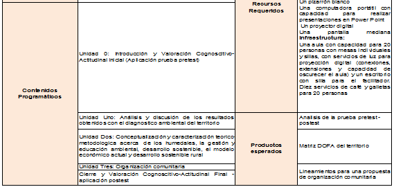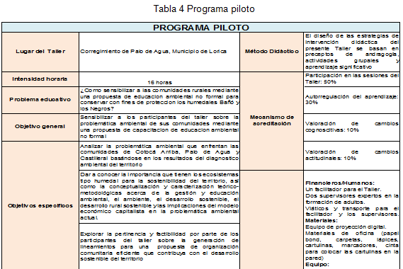 La validación del modelo de EANF propuesto se materializó mediante una prueba piloto de un programa de intervención educativa. Dicho programa piloto tuvo una intensidad de 16 horas dividido en dos sesiones de ocho horas cada una y fue llevado a cabo en el corregimiento de Palo de Agua. Igualmente, contó con un problema educativo por resolver, unos objetivos, un contenido programático, una metodología de trabajo, mecanismos de acreditación, unos recursos requeridos y unos resultados y productos esperados (Ver Tabla 4). Como población meta o beneficiada se consideró a todas aquellas personas a las que se les aplicó el cuestionario de caracterización socio-ambiental arriba mencionado, y que por su actividad económica se categorizaban en pescadores, agricultores, ganaderos, mineros y oficios varios. La invitación se realizó mediante los diferentes líderes comunitarios y de puerta a puerta. La participación fue voluntaria y asistieron un total de 14 individuos, de los cuales 13 pertenecían al corregimiento de Palo de Agua y uno a Cotocá Arriba; sin participante alguno del corregimiento de Castilleral. Se señala que a las personas invitadas se les dio fechas optativas para que seleccionaran las que más les convinieran a la hora de poder asistir al taller. Se les preguntó también a los participantes y líderes comunitarios por qué a pesar de la invitación ser abierta, sólo asistieron 14 individuos; las razones manifestadas fueron básicamente dos: no les interesaba conocer los resultados del estudio a las demás personas, y no querían participar en ningún taller. También se puede incluir como otra posible causa de inasistencia que para el momento en que se aplicó el taller (septiembre de 2015) estaban en furor las campañas políticas en la región.