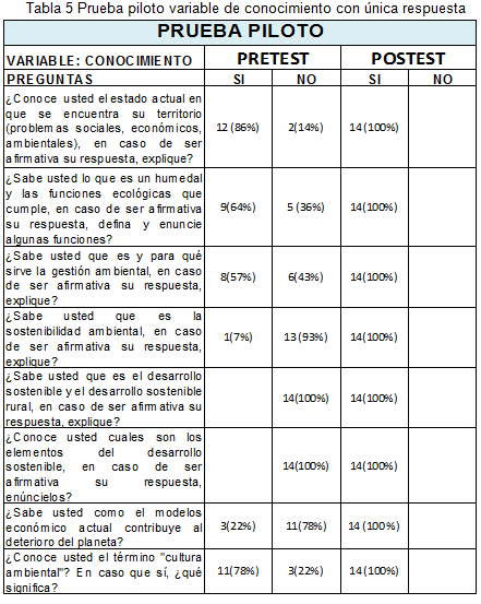 Con la aplicación de la prueba piloto se observó que en términos de adquisición de conocimientos, el programa o taller piloto derivado del modelo sí fue útil. La adquisición de conocimientos para un antes y un después acerca de lo que era un humedal y su importancia ecológica, qué era la gestión ambiental y para qué servía, qué era la sostenibilidad ambiental, el desarrollo sostenible y el desarrollo rural sostenible, cuáles eran los elementos del desarrollo sostenible y cómo el modelo económico capitalista influía en el deterior del planeta se veían reflejados en los datos porcentuales obtenidos. Al preguntarles a los participantes del taller si tenían conocimiento acerca de la problemática ambiental de su territorio, dos personas (14%) no tenían un conocimiento de los principales problemas que los aquejaban. Un 36% (5) de las personas no sabían lo que era un humedal, su importancia ecológica y las funciones que cumplía éste. El 43% (6) de los individuos no conocían qué era la gestión ambiental y la finalidad de la misma. Igualmente, 93% (13) de los participantes no tenían idea alguna de lo que era la sostenibilidad ambiental del territorio. Por otra parte, el 100% (14) de los participantes no tenían conocimiento alguno de lo que eran el desarrollo sostenible, el desarrollo sostenible rural y los elementos del desarrollo sostenible. Un 78% (11) de los sujetos no tenía conocimiento de cómo el modelo económico actual incidía en el deterioro del planeta y un 22% (3) no poseían conocimiento de lo que era la cultura ambiental (Los datos suministrados corresponden al momento de realizar la prueba piloto previa).