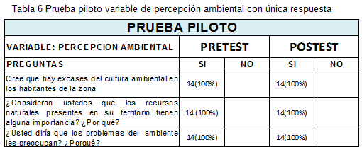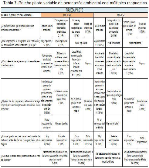 Las estadísticas cambiaron a favor de la obtención de conocimiento una vez se realizaron las respectivas acciones de cualificación ambiental que iban desde la exposición magistral hasta actividades grupales y los respectivos debates de ideas. Todos los sujetos que no tenían un conocimiento acerca de los ítems sobre los que se les preguntaba previamente, después de la intervención, daban respuestas claras y acertadas, y aquéllos que en la prueba inicial contestaron acertadamente, al volverles a preguntar expresaron respuestas fueron mucho más estructuradas y con más soporte técnico ambiental. Se indica que en la prueba piloto posterior para el 100% (14) de las personas que dieron respuestas acertadas, se incluyó tanto a las personas que no tenían conocimiento alguno de lo que se les preguntaba, como a las que sabían y después de la intervención educativa dieron respuestas mucho más puntuales (Ver Tabla 5). Ahora, en términos de percepciones ambientales no hubo variación porcentual en las respuestas de los encuestados, tanto para la previa como para la posterior (los 14 sujetos encuestados), en términos de que todos creían que hubo escasez de cultura ambiental en las poblaciones vecinas de los humedales; les parecían importantes los recursos naturales de su territorio y también les preocupaba los problemas ambientales que existían en la actualidad, porque de una u otra forma los afectaba. De lo anterior, se concluyó que las personas eran conscientes de la importancia que tenía la protección del entorno para la supervivencia de sus comunidades y de lo necesario que era mantener equilibrada una relación ser humano – medio ambiente (Ver Tabla 6).