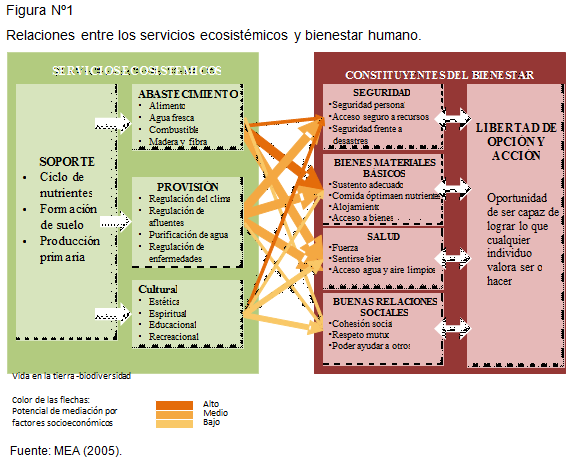 La Evaluación de Ecosistemas del Milenio (MEA, 2005) definió cinco determinantes del bienestar humano: seguridad, salud, relaciones sociales, bienes materiales básicos, libertad de elección y acción. Además, sus autores establecieron semi-cuantitativamente las relaciones entre estos y los SE de provisión, regulación y culturales (Figura 1).