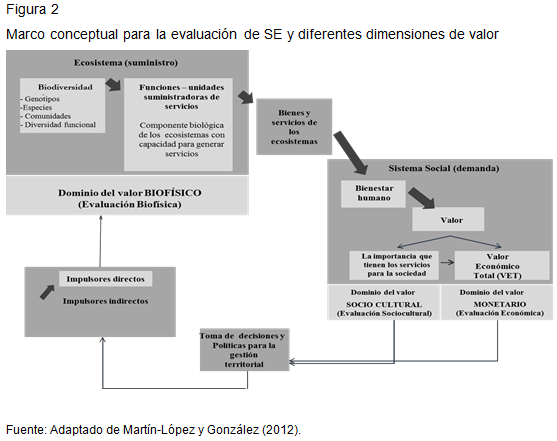 Martín-López y González (2012), proporcionan un marco conceptual para la comprensión de un proceso de evaluación de SE enfocado a la gestión del territorio. Este marco permite identificar diferentes dimensiones de valor que debieran, idealmente, ser consideradas en los procesos de toma de decisión territorial, en forma conjunta.