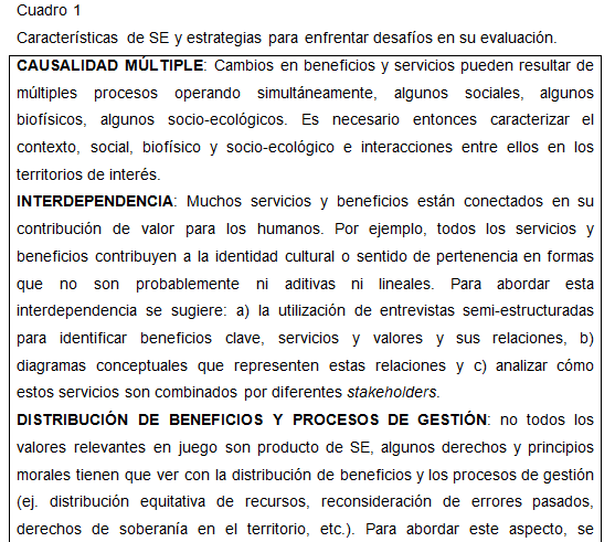 El cuadro 1 muestra un set de características de los SE culturales, sus beneficios y valores asociados (especialmente no materiales) y algunas estrategias para enfrentar los desafíos para la evaluación y expresión de estos valores en procesos de toma de decisión territorial.